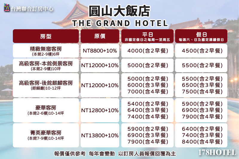 17P ►台北圓山大飯店 精緻雙人客房(含早餐) 平日4000 台灣聯合訂房中心