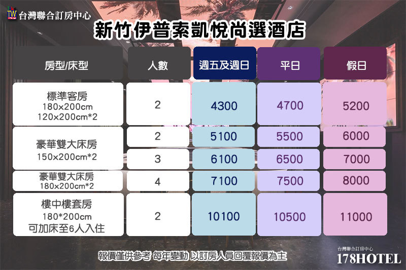 使用說明 1. 本方案可雙人住宿標準客房(一大床/二小床)乙晚 2. 含早餐 3. 限週五及週日,平日、假日或其他房型請參見下表 4. 平假日定義請依官網公告為準 5. 此專案為代訂房服務煩請提供入住人姓名、聯絡電話及需求房型,可加@uhotel01,或電:0980-435-088 6.入住時間:下午15:00,退房時間:上午11:00 7. 本方案不得與其他優惠及專案合併使用 8. 農曆春節期間不適用 標準客房 豪華雙大床房 豪華雙大床房(加大床) 樓中樓套房 SODBAR SOIAL 健身房 以上圖片僅供參考。本網保留訂單成立與否權利。