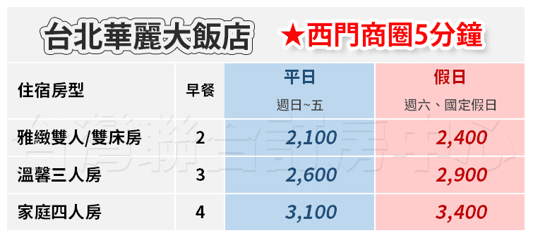 17P ►台北西門町 華麗大旅店 雙人房平日(含早餐) 2100元 代訂房