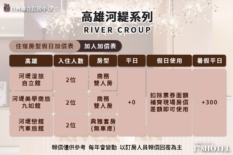 4.券為平日住宿券,假日期間住宿需補加價費用(請參閱住宿房型假日加價表、加人加價表、平假