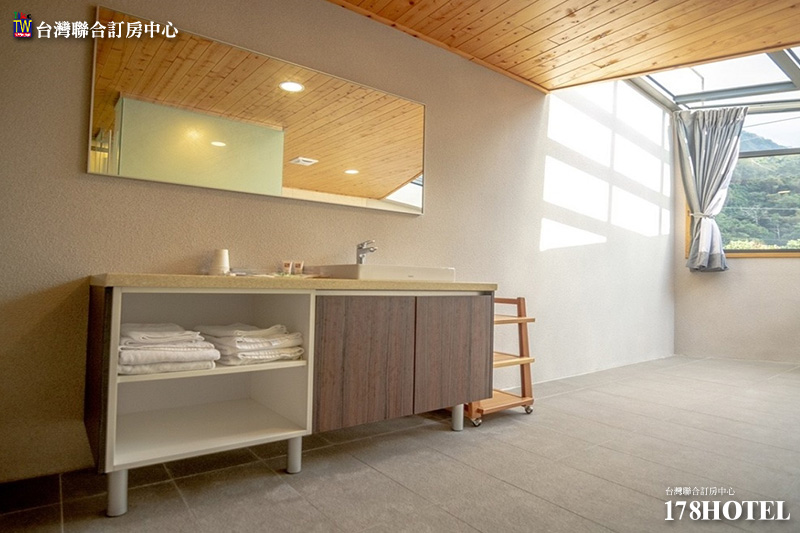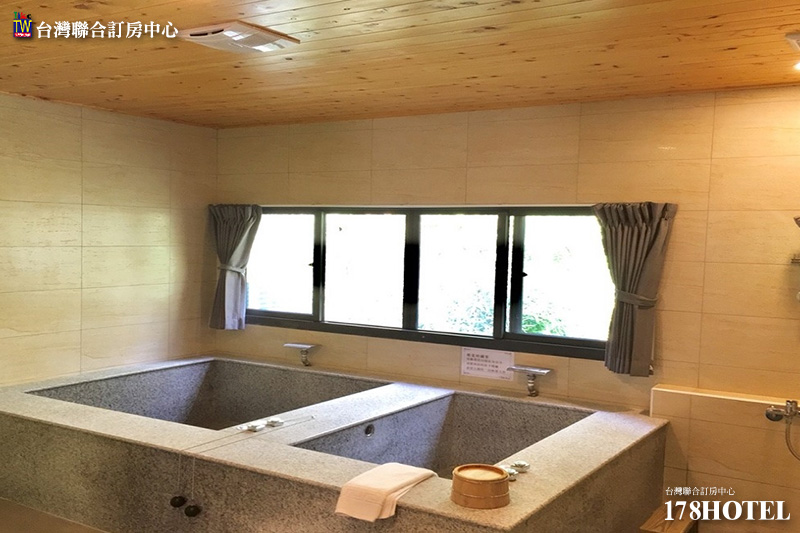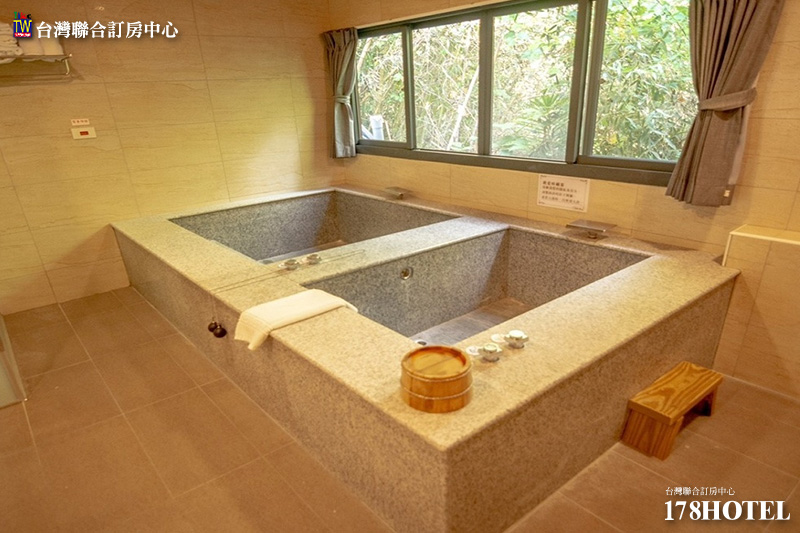 而房內獨立的泡湯雙浴池,使用山林中匯集流下的山泉冷水,及地熱加熱的碳酸氫鈉泉水又稱「美人湯」的熱泉。